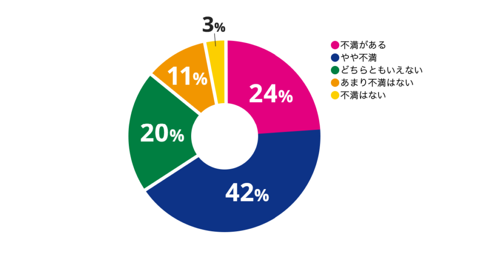 「不満はない」と答えた人が3%しかいないことからも、働く環境としてはやや厳しい状況であることがうかがえる。